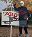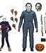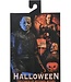 Diese 18 cm große Ultimate Michael Myers Actionfigur enthält austauschbare Köpfe, eine abgenommene Maske, mehrere austauschbare Hände, eine Axt, eine Machete, ein Brecheisen, Küchenmesser, einen Beutel mit Runen, Opferkerzen, ein Bündel Spritzen und einen Kürbis. Außerdem ist ein Strode Realty-Schild mit Michael-Myers-Ausschnitt enthalten.