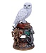 Auf einem Stapel Zauberbücher sitzt Hedwig, Harry Potters ewig treue Schneeeule. Der Sockel der Figur ist sehr detailliert und zeigt die Wappen der vier Hogwarts-Häuser Gryffindor, Slytherin, Hufflepuff und Ravenclaw.