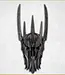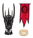 Der aus verstärktem Polyresin gegossene Helm mit korrodierter, hitzeverfärbter Oberfläche verfügt über ein mit echtem Leder gefüttertes und gepolstertes Interieur. Jede Oberfläche ist handgefertigt, um dem Original-Requisit von Weta Workshop zu entsprechen und die rankenartigen Gravuren, die Eisenstruktur und die sechs bedrohlichen Stacheln, die Sauron im Kampf krönten, detailgetreu wiederzugeben.