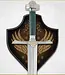 Diese detailgetreue Schwertreplik ist eine originalgetreue Nachbildung des Filmrequisitenschwertes, gefertigt von Weta Workshop aus Neuseeland und verwendet in den „Herr der Ringe™“-Filmen von New Line Cinema. Das 107 cm lange Schwert besticht durch seine sorgfältig gearbeitete Parierstange und den Knauf aus massivem Metall mit antiker Stahloberfläche sowie einen Griff aus echtem Leder. Die Parierstange ist mit zwei goldenen Rabenmotiven verziert, der Knauf mit goldenen Ringen. Die 84 cm lange, stumpfgeschliffene Klinge ist aus gehärtetem Edelstahl gefertigt und verfügt über eine Hohlkehle. Jedes Schwert wird mit einem Wandständer aus Holz und einem Echtheitszertifikat geliefert.