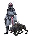An seiner Seite steht ein Massiff, ausgestattet mit einem detailreichen Geschirr, einer Metallkettenleine und einem Griff. Er verfügt über einen beweglichen Kiefer und leicht bewegliche Vorder- und Hinterbeine, sodass Sammler die Verbindung zwischen dem Soldaten und dem Fährtenleser zum Leben erwecken können. Das Aussehen dieses Massiff-Accessoires ist sowohl von den Klonkriegen als auch von Live-Action-Star-Wars-Medien inspiriert und würdigt die animierten Ursprünge der Kreatur, während es gleichzeitig den Realismus von Live-Action aufgreift. All dies wird auf einem speziell entworfenen Figurenständer präsentiert, der das Star-Wars-Logo und Hounds Charakternamensschild trägt, was dieses Sammlerstück zu einer eindrucksvollen Hommage an einen der rätselhaftesten Agenten der Republik macht.