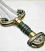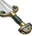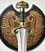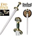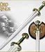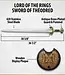 It was virtually identical, except for its green enameling on the hilt and green leather grip. This authentically detailed sword replica is a reproduction of the actual filming prop sword crafted by Weta Workshop of New Zealand and used in The "Lord Of The Rings: The Two Towers" film presented by New Line Cinema. This meticulously detailed sword, with an overall length of 36 1/2", features a solid metal guard and pommel with an antique brass plated finish and a tough TPU grip. The 30 1/8" false-edged blade is crafted of tempered stainless steel with a wide filler groove. Each sword is individually serial numbered and presented with a wood wall display and certificate of authenticity.