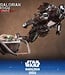 Ready for any bounties the galaxy throws his way, Mando comes heavily equipped with a newly developed Amban phase-pulse sniper rifle, a new scoped sniper rifle, a new gladius sword, his IB-94 blaster pistol, a vibroblade, a bendable fiber-cord whip, and a grav charge. He also comes equipped with his magnetically attachable jetpack and a flamethrower effect to recreate intense battle scenes. The entire ensemble is perfectly tied together with a snow-themed figure stand.