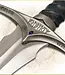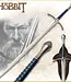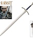 This authentically detailed replica is a reproduction of the actual filming prop built by Weta Workshop of New Zealand and used in the motion picture, THE HOBBIT: AN UNEXPECTED JOURNEY. United Cutlery, industry leader in fine movie reproductions, has meticulously recreated the prop using only the finest grade materials and craftsmanship. Close attention to detail was a top priority. The Glamdring sword is 120.96 cm overall, featuring a stainless steel blade, solid metal hilt parts, faux blue jewel inlays, and a genuine leather-wrapped grip. It is presented with a wood wall display and includes a certificate of authenticity.
