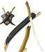 Materiaal van de schede: Massieve metalen kraag en punt met een 24-karaats vergulde afwerking. Echt lederen omhulsel met een reliëf van een elfenrank.